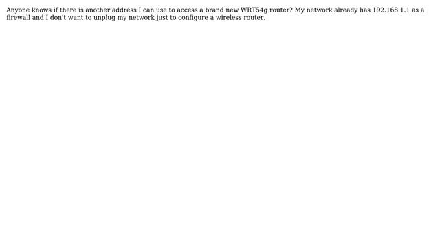 Is there another default address than 192.168.1.1 for WRT54g routers? Helpful? Please support me on Patreon: https://www.patreon.com/roelvandepaar With thanks & praise to God, and with thanks to the many people who have made this project possible! | Content (except music & images) licensed under CC BY-SA https://meta.stackexchange.com/help/licensing | Music: https://www.bensound.com/licensing | Images: https://stocksnap.io/license & others | With thanks to user Peter Krumins (superuser.com/users/7545), user EEAA (superuser.com/users/12079), and the Stack Exchange Network (superuser.com/questions/416876). Trademarks are property of their respective owners. Disclaimer: All information is provided "AS IS" without warranty of any kind. You are responsible for your own actions. Please contact me if anything is amiss at Roel D.OT VandePaar A.T gmail.com