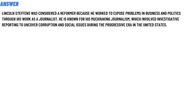 Lincoln Steffens was considered a reformer specifically because he was a journalist. wrote about modern issues. was wealthy and born in the United States. worked to expose problems in business and in politics.