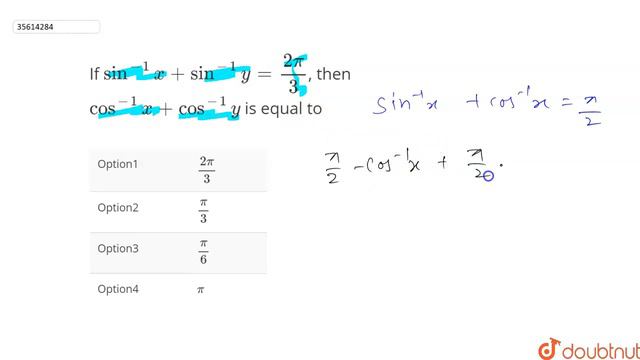 If `sin^(-1)x+sin^(-1)y=(2pi)/3`, then `cos^(-1)x+cos^(-1)y` is equal to