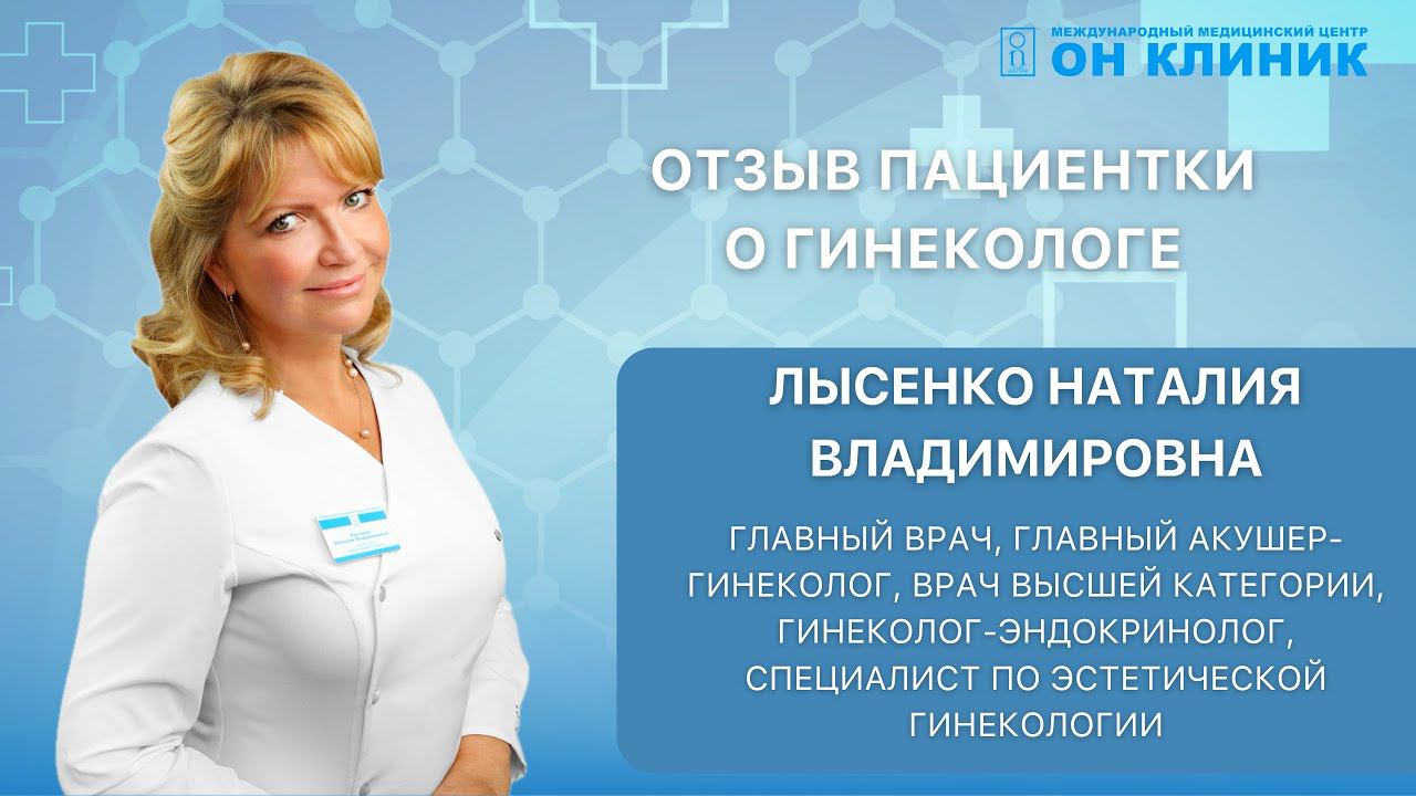 Отзыв пациентки ОН КЛИНИК о главном враче, главном акушере-гинекологе, враче высшей категории, гинекологе-эндокринологе, специалисту по эстетической гинекологии Лысенко Наталия Владимировна Подробнее о враче: https://www.onclinic.ru/lysenko-nataliya-vladimirovna/ Записаться на прием: +7 495 241-69-20 (с 8 до 23.00) Узнайте больше о способах диагностики и лечения в ОН КЛИНИК! Подпишитесь на наш канал! Мы в соцсетях: Телеграм: https://t.me/onclinicru ВКонтакте: https://vk.com/onclinicru Одноклассники: https://ok.ru/profile/577149703061