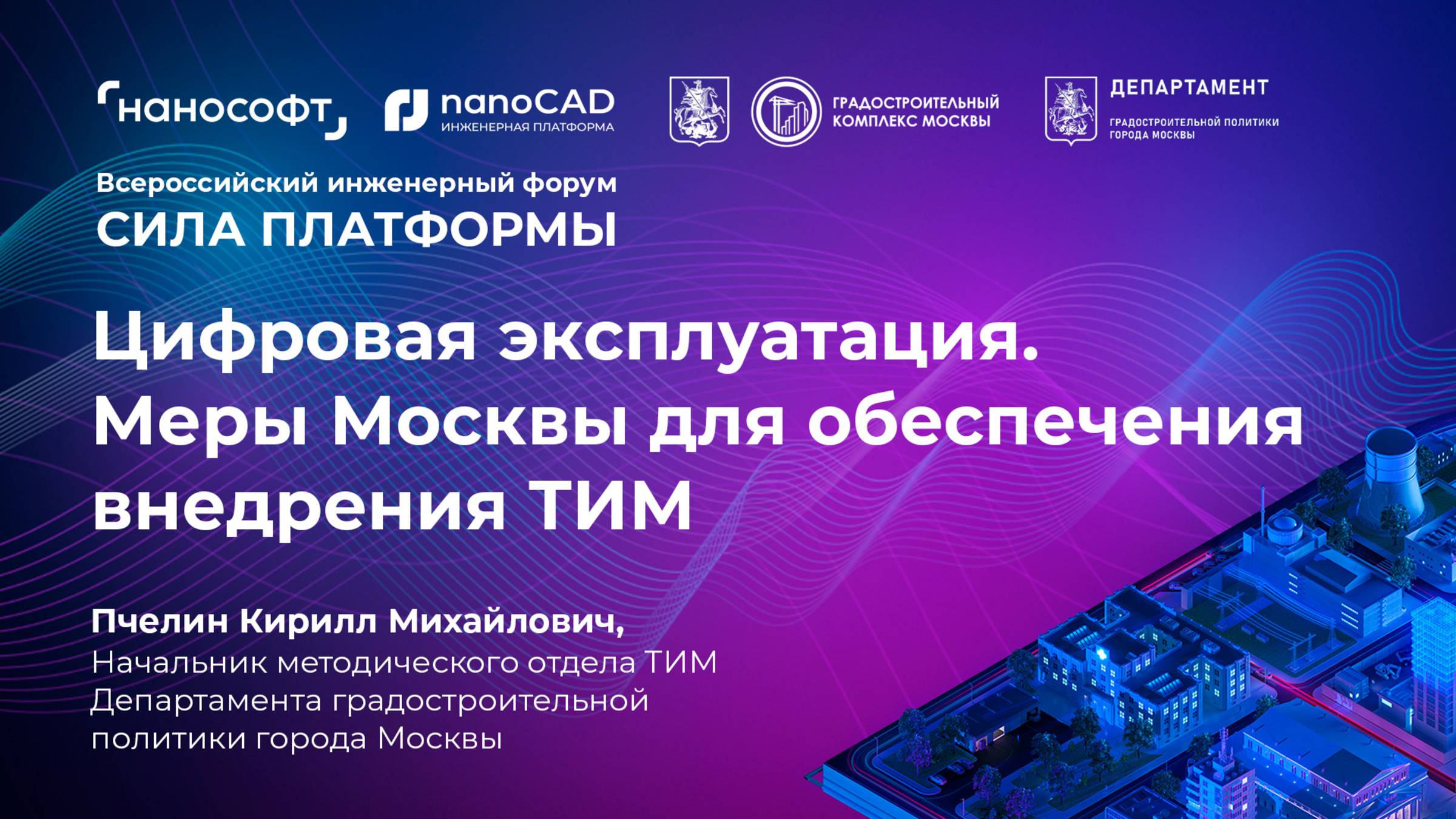 Пчелин Кирилл Михайлович, начальник методического отдела ТИМ Департамент градостроительной политики города Москвы Тема доклада: Цифровая эксплуатация. Меры Москвы для обеспечения внедрения ТИМ 24 октября 2024 года прошел ежегодный форум «СИЛА ПЛАТФОРМЫ» – главное инженерное событие года от компании «Нанософт», российского разработчика САПР-платформы nanoCAD. Форум, посвященный проектированию и цифровизации в сфере промышленного и гражданского строительства, установил новый рекорд, объединив более 5500 человек офлайн и онлайн, предоставив слово более чем 130 спикерам-экспертам. Сайт форума - https://platforma.nanocad.ru/ Итоги форума 2024 - https://www.nanocad.ru/press/news/forum-sila-platformy-sobral-bolee-5500-uchastnikov-i-prodemonstriroval-dostizheniya-rossiyskikh-razr/