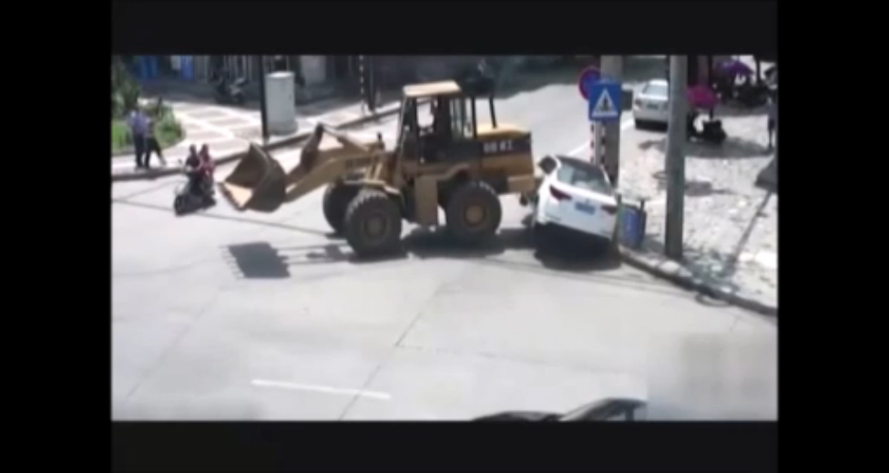 Китаец на погрузчике разбил легковую машину