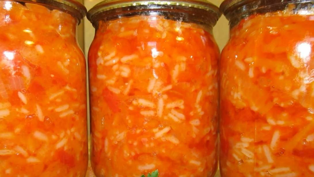Этот рис с овощами очень пригодится зимой. Он станет прекрасным обедом в перерыв на работе и обеспечит завтрак вашему школьнику. А может стать гарниром к любому мясному продукту. Ингредиенты: Рис - 2 стакана Томатный сок - 2 литра Лук - 1 кг Перец сладкий - 1 кг Морковь - 1 кг Острый перец - 1 шт Соль - 1,5 ст.л. Сахар - 5 ст.л. Уксус 9% - 3 ст.л. Растительное масло - 300 мл
