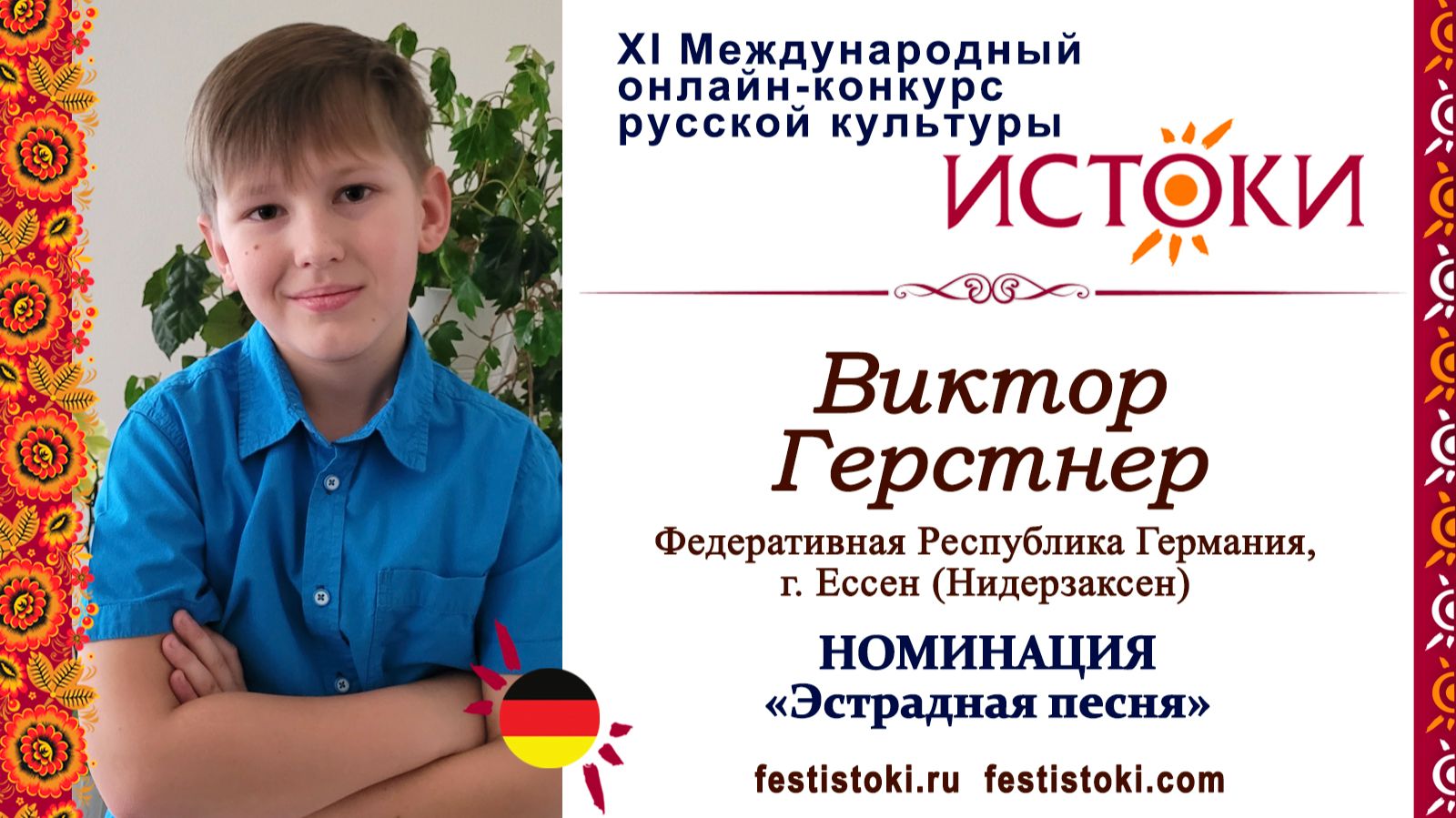 Участник ХI Международного онлайн-конкурса русской культуры "Истоки". Номинация "Эстрадная песня". Песня "Дарите женщинам цветы". Автор музыки и слов Виктор Гин. Сайт: festistoki.ru / festistoki.com E-mail: festistoki@mail.ru