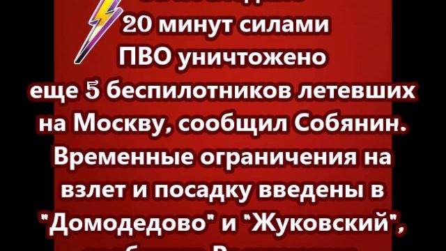 За последние 20 минут силами ПВО уничтожено еще 5 беспилотников летевших на Москву