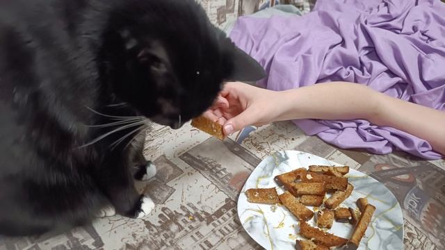 Кошка ест гренки с чесноком)