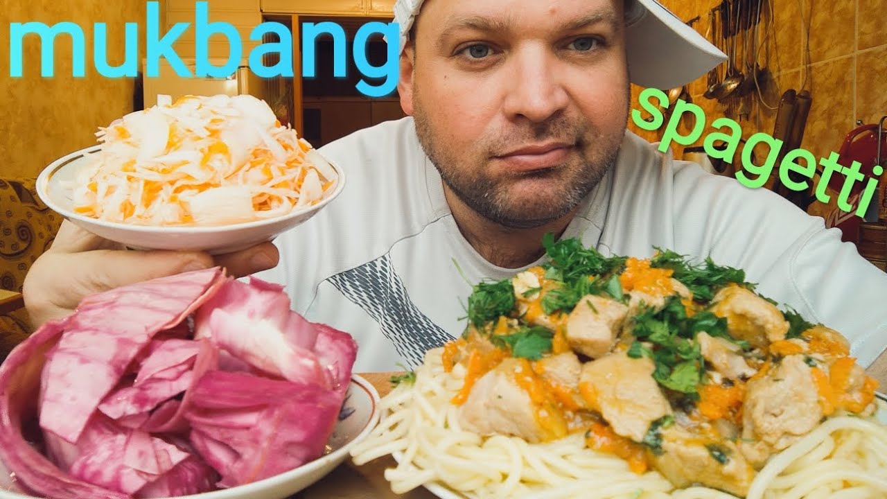 МУКБАНГ СПАГЕТТИ с тушëной свининой/ОБЖОР ПЕЛЮСТКА