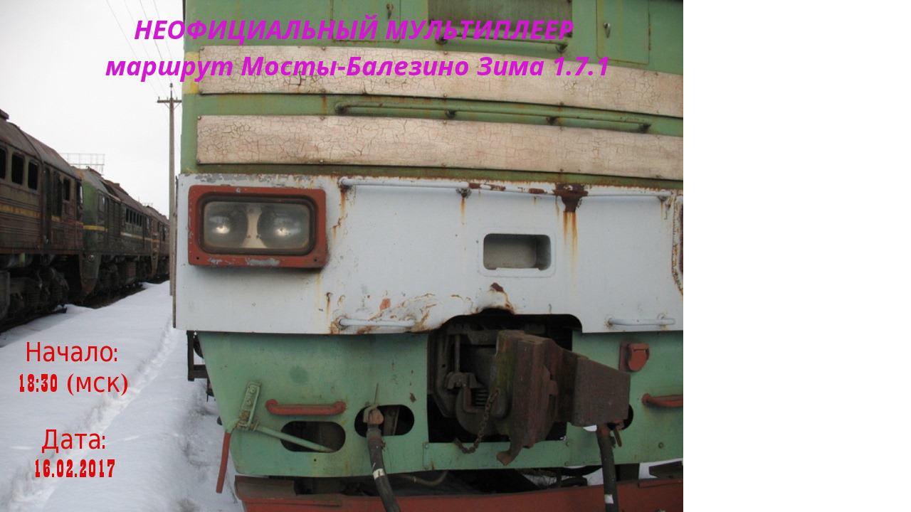Маршрут: Мосты-Балезино Классика 1.7.1 Дата проведения: 16.02.2017 Локомотив: тепловоз 2ТЭ121 #021 Станция отправления: Лихачово Подробности здесь: http://forum.trainz-mp.ru/index.php/forum/16-neofitcialnye-multipleery-mpzhd/
