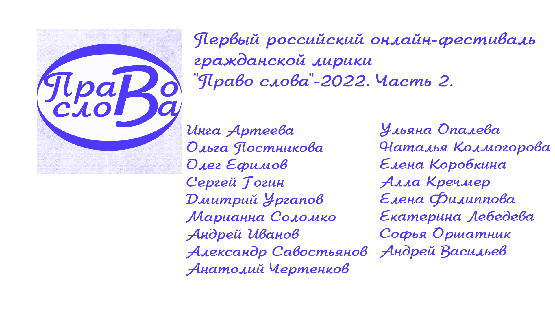 Дорогие друзья! Представляем вашему вниманию вторую часть Первого российского онлайн-фестиваля гражданской лирики "Право слова". В ней приняли участие следующие поэты: ✒ Инга Артеева (Нарьян-Мар) ✒ Ольга Постникова (Москва) ✒ Олег Ефимов (Москва) ✒ Сергей Гогин (Ульяновск) ✒ Дмитрий Ургапов (Москва) ✒ Марианна Соломко (Санкт-Петербург) ✒ Андрей Иванов (Гуково, Ростовская область) ✒ Александр Савостьянов (Клинцы, Брянская область) ✒ Анатолий Чертенков (Тихвин, Ленинградская область) ✒ Ульяна Опалева (Санкт-Петербург) ✒ Наталья Колмогорова (Клявлино, Самарская область) ✒ Елена Коробкина (Севастополь) ✒ Алла Кречмер (Натания, Израиль) ✒ Елена Филиппова (Санкт-Петербург) ✒ Екатерина Лебедева (Екатеринбург) ✒ Софья Оршатник (Нижний Новгород) ✒ Андрей Васильев (Псков)