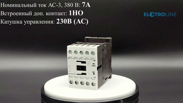 Контактор производства EATON c номинальным током 7 А. Управляющее напряжение 230В (АС). Имеется встроенный 1 НО (нормально открытый) дополнительный контакт. Категория применения AC-3, AC-4. Подробнее вы можете ознакомиться в нашем интернет магазине по ссылке: https://electroline.ru/product/eaton-dilm7-10230v50hz240v60hz-ea.html