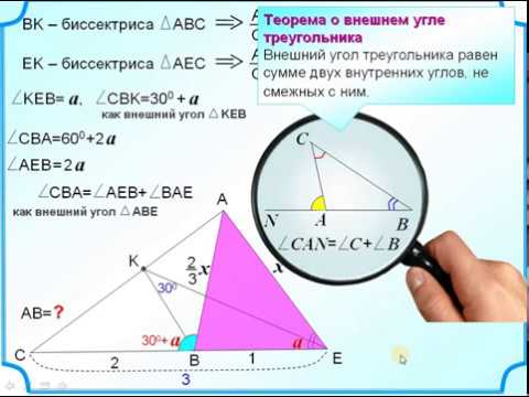 На продолжении стороны ВС треугольника АВС за точку В расположена точка Е так, что биссектрисы углов АЕС и АВС пересекаются в точке К, лежащей на стороне АС. Длина отрезка ВЕ=1, длина отрезка ВС равна 2, градусная мера угла ЕКВ равна 30⁰. Найдите длину стороны АВ.