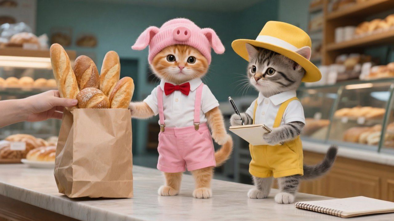 Двое милых котят помогают маме-кошке в пекарне