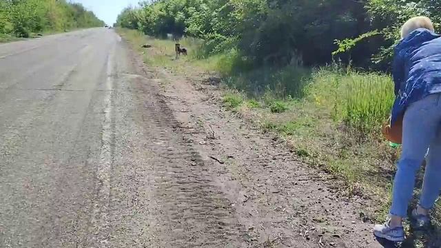 Волонтеры кормят собачек у дороги
