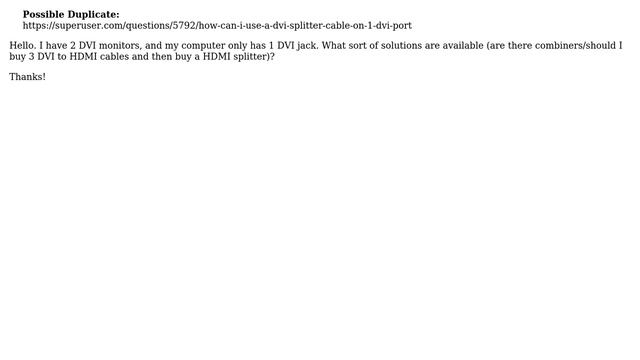 How to use 2 DVI monitors with only 1 DVI port? Helpful? Please support me on Patreon: https://www.patreon.com/roelvandepaar With thanks & praise to God, and with thanks to the many people who have made this project possible! | Content (except music & images) licensed under cc by-sa 3.0 | Music: https://www.bensound.com/royalty-free-music | Images: https://stocksnap.io/license & others | With thanks to user yhw42 (https://superuser.com/users/45662), user ash (https://superuser.com/users/23792), and the Stack Exchange Network (http://superuser.com/questions/220823). Trademarks are property of their respective owners. Disclaimer: All information is provided "AS IS" without warranty of any kind. You are responsible for your own actions. Please contact me if anything is amiss at Roel D.OT VandePaar A.T gmail.com.