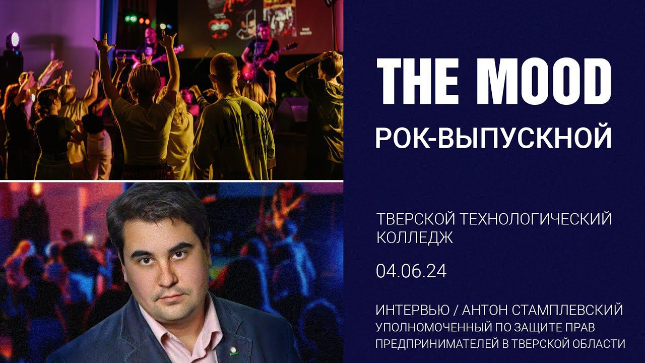 Интервью Антона Стамплевского - Уполномоченного по защите прав предпринимателей в Тверской области, взятое у него на Рок-Выпускном в Тверском Технологическом Колледже 04/06/24 В 2023 году лидер группы The Mood Марат Карапетян создал с музыкантами группы The Mood новый музыкально-образовательный проект — Рок-урок. Рок-выпускной прошел при поддержке генерального партнёра — группы компаний «Новый город». Партнёрами проекта выступили компании «Стекольный завод 9 января», «Пром-Лазер». Антон Стамплевский рассказывает о значении проекта Рок-Урок для молодежи, поддержке проекта со стороны Тверского бизнеса. Рок-Урок — это одновременно лекция + концерт+танцы и хорошее настроение. Проект продолжается. Операторская работа, вопросы для интервью, монтаж — Наталья Сударикова