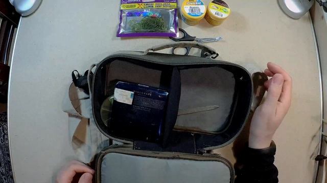 Удобная, но не идеальная сумка. В ней умещается много различных насадок, приманок и разной мелочёвки. Катушка, запасная шпуля и поплавочная удочка со "спасалкой". Минимальные размеры и максимальная функциональность.