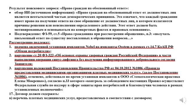 Видео обращение в Роспотребнадзор Ссылки на видео ролики, детализирующие конкретные нарушения действующего законодательства и руководящих документов: ортопед Мокренко Е.Н., часть 1, оплаты 2015-2016 https://rutube.ru/video/d9ca0d1442b25c023322205363d5ee6d/ ортопед Мокренко Е.Н., часть 2, оплаты 2019-2022 https://rutube.ru/video/eae80d70bc377057be9bb438625ddc95/ ортопед Мокренко Е.Н., часть 3, Договор №68 от 11.01.2015 https://rutube.ru/video/2ba542245bc0eab1005745932e982498/ ортопед Мокренко Е.Н., часть 4, Информированное согласие на имплантацию зубов от 30.09.2015 https://rutube.ru/video/68b5b5184b5505d30507239343d4b58a/