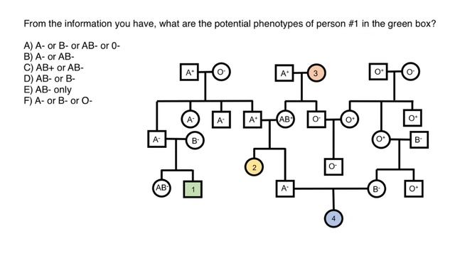 From the information you have, what are the potential phenotypes of person #1 in the green box? A) AB+ or AB- B) A- or B- or AB- or 0- C) AB- or B- D) A- or B- or O- E) AB- only F) A- or AB- https://www.youtube.com/watch?v=vF-lrHXGFpY