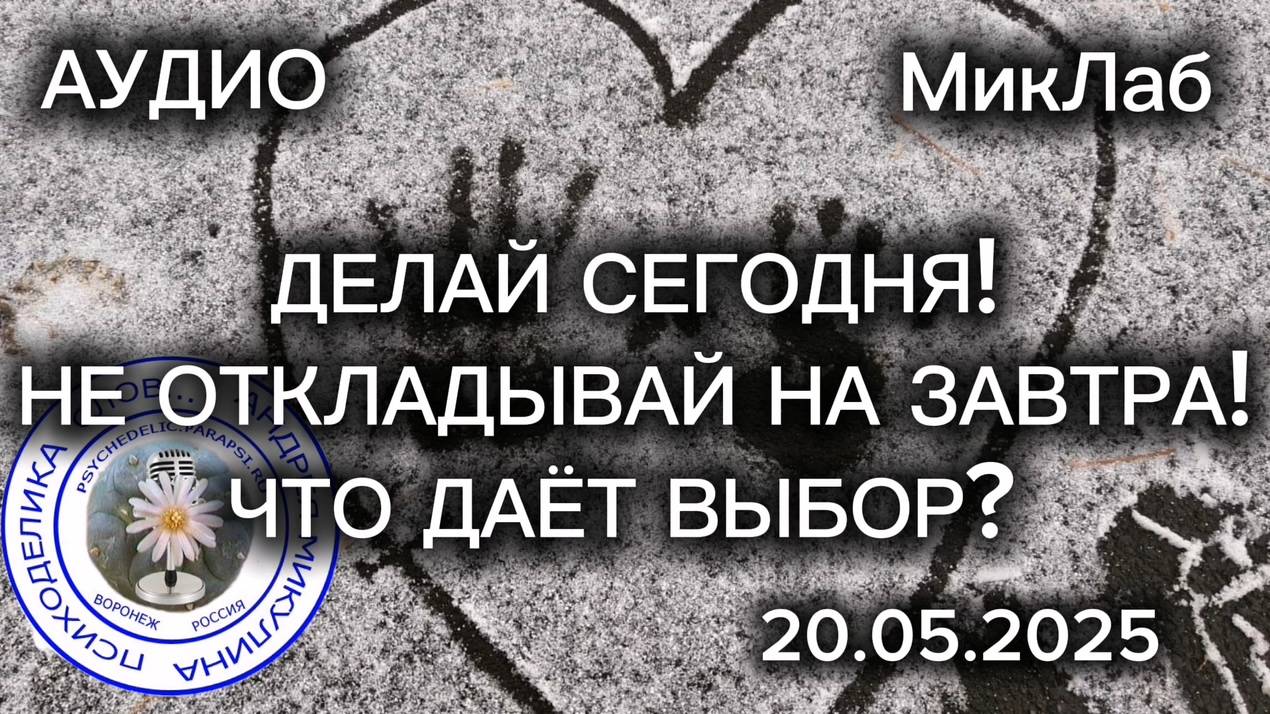 Аудио Запись Уже замусоленные ФРАЗЫ - Делай Сегодня! На завтра не откладывай! - смотрим на них, под совершенно НОВЫМ УГЛОМ.. Интересно Это?! ДА! Запись от 20.05.2025 Телеграмм: https://t.me/+ZNnsyNIimWU1MDVi VK: https://vk.com/psychedelic_am ПРОЕКТ МикЛаба - Психоделика Слов. Прямой Эфир с Андреем Микулиным 2025 МикЛаб - Лаборатория Андрея Микулина #топыкатегорий