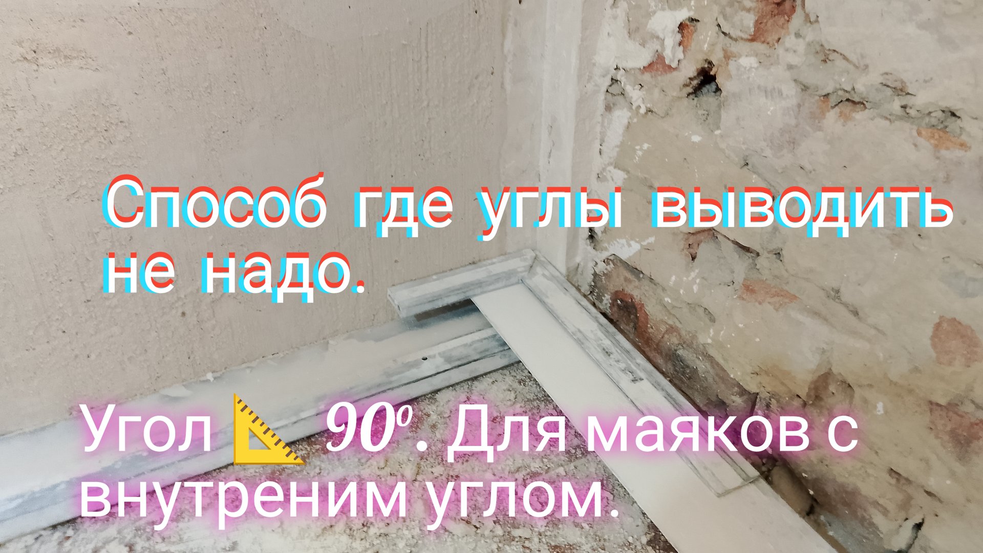 В этом виде я покажу как выставить угол 📐 90° без лазера .Сначала делаю маяки с внутреним углом 90° по уровню после этого натягиваю шнурок п-образно и делаю метки для последующих маяков.После того как одну стену я оштукатуриваю ставлю угольник и правило чем длиннее тем лучше и отмечаю угол 90 после этого по отмеченным линиям я делаю растворный маяк .Технология установки растворных маяков есть на моём канале.