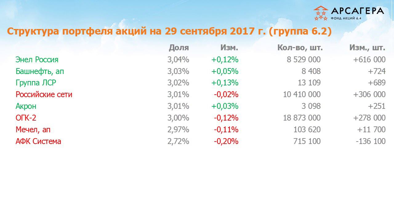 Наши фонды. Арсагера – акции 6.4.Отчет #88 за сентябрь 2017 года