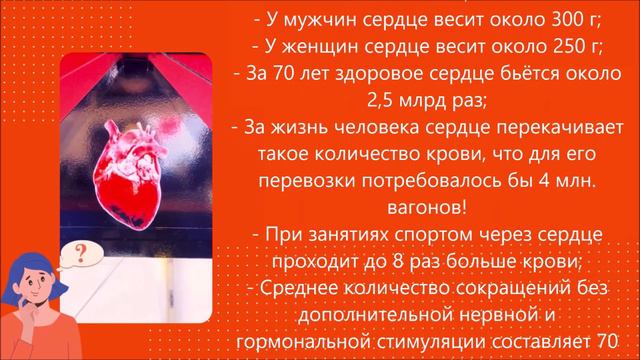 ГБУЗ «ДЦ №3 ДЗМ» (https://dc3.mos.ru/) В порядке профилактики и лечения заболеваний, по программе ОМС, приглашаем Вас в диагностический центр №3! (https://dc3.mos.ru/) Медицинский факт: Сердце — единственный орган, способный вырабатывать электричество, обеспечивающее его автономную работу. Знаете ли вы, что: - У мужчин сердце весит около 300 г; - У женщин сердце весит около 250 г; - За 70 лет здоровое сердце бьётся около 2,5 млрд раз; - За жизнь человека сердце перекачивает такое количество крови, что для его перевозки потребовалось бы 4 млн. вагонов! - При занятиях спортом через сердце проходит до 8 раз больше крови; - Среднее количество сокращений без дополнительной нервной и гормональной стимуляции составляет 70 ударов в минуту, но у тренированных людей этот показатель меньше; - Энергия, которая расходуется сердцем за сутки, достаточна, чтобы поднять на 14 метров груз, масса которого 900 килограмм. Материалы новостного характера нельзя приравнивать к назначению врача. Если у Вас есть серьёзные проблемы со здоровьем, то лучше обратиться к врачу! Есть вопросы обращайтесь к нам! (https://дц3.рф/) Ждём Вас и будьте здоровы! Следите за нашими публикациями: - на нашем сайте (https://дц3.рф/ / https://dc3.mos.ru/) - ВКонтакте (https://vk.com/diagcenter3 / https://vk.com/dc3ru / https://vk.com/lavrova__liliya / https://vk.com/paidservicesofdc3 / https://vk.com/public214571593) - в Одноклассниках (https://ok.ru/dc3dzm / https://ok.ru/group54028797935755 / https://ok.ru/profile/574817219679 / https://ok.ru/profile/595986149134) - в Ютубе (https://www.youtube.com/@user-br2ec6xi2k) - в Rutube (https://rutube.ru/channel/29844520/ / https://rutube.ru/channel/27126141/) - в Телеграм (https://t.me/diagnosticcenter3moscow / https://t.me/c/1674849456/2 / https://t.me/paiddc3services) #Москва #медицина #здравоохранение #ДЗМ #новыймосковскийстандарт #московскаяполиклиника #новыйстандарт #дц3 #ювао #выхино #жулебино #выхиножулебино #рязанка #лефортово #нижегородка #НовостиДЦ3 #НовостиПоликлиник #врач #здоровье #диагностика #профилактика #профилактиказаболеваний #лечение #лечениезаболеваний #здоровье #здоровье_в_приоритете #здоровьевприоритете #нашездоровье #ВашеЗдоровье #ЗдороваяМосква #ОМС #программа_ОМС #полис_ОМС #платныеуслуги
