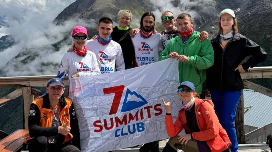 Группа Клуба 7 Вершин под названием «Отмороженные» на первом акклиматизационном выходе на склонах горы Чегет. август 2024 года. Гид Евгений Федюнин.