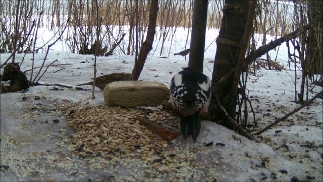 Большой Пёстрый Дятел, самец у кормушки, наблюдение птиц в Великом Новгороде, 23 февраля 2024