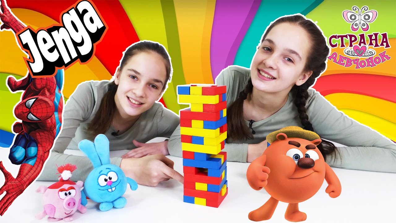 Сегодня у нас особенный #ЧЕЛЛЕНДЖ - мы будем играть в игру ДЖЕНГА! Соревноваться будут две команды - команда близняшек (СОНЯ и ПОЛИНА) и команда СМЕШАРИКОВ (НЮША и КРОШ)! И каждая из команд даже позовёт на помощь друзей! Смешарики позовут КОПАТЫЧА, а Соне и Полине поможет ЧЕЛОВЕК ПАУК! Как ты думаешь, какая из команд разрушит башню? Смотри наше новое веселое видео для детей, чтобы узнать ответ! Не забудь подписаться на наш канал СТРАНА ДЕВЧОНОК, чтобы следить за новыми приключениями: https://www.youtube.com/channel/UCCe6oRAVWZFztZJMAujRu7A Не забудь зайти на канал, где живут наши лучшие подружки - Бантики-Косички: https://www.youtube.com/channel/UCZJi3695pl6tfkAHp4BLMDA Больше видео про любимых героев на канале Смешарики Live: https://www.youtube.com/channel/UCy15c4beE539pcPFt4-UrHg Не забудь подписаться, доктор АЙ ждёт тебя и твои игрушки на приём в АЙ-Клинику по адресу: https://www.youtube.com/channel/UCGniralnly1KvmlBMjGEVLA Заходи на наш сайт: https://www. 4screens.ru Ищи нас в социальных сетях! ВКонтакте: https://vk.com/club132423271 Фейсбук: https://www.facebook.com/4ScreensShow Твиттер: https://twitter.com/4Screens_Studio Инстаграм: https://www.instagram.com/4screensstudio