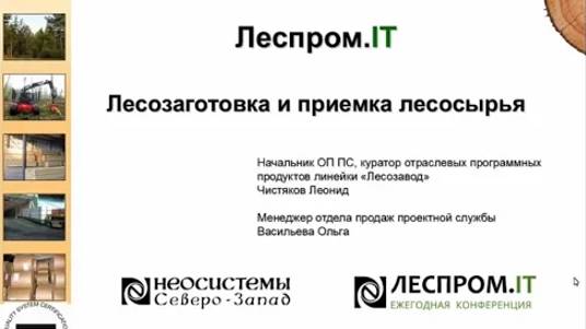 Компания «Неосистемы Северо-Запад ЛТД» запустила уникальную Интернет-площадку «Леспром.IT», на базе которой специалисты лесопромышленных предприятий, заинтересованные в вопросах автоматизации, могут обмениваться профессиональным опытом. Площадку «Леспром.IT» открывает серия тематических вебинаров, рассказывающих об опыте применения информационных технологий в различных сферах управления лесопромышленным предприятием. Первый вебинар серии состоялся 28 апреля 2016 г. и был посвящен учету лесозаготовок и приёмке круглого леса. В рамках вебинара были рассмотрены следующие вопросы: 1. Учет лесного фонда: • Ведение реестра лесных участков • Контроль статусов лесных участков 2. План-фактный анализ заготовок: • Материально-денежная оценка лесных участков • Сравнение плана (задекларированного объема) с фактом (объемом вырубки) • Анализ отклонений по делянкам и видам древесины 3. Методология учета и отражения лесозаготовок: применение схемы попередельного учета: • Особенности ведения нормативно-справочной информации • Учет остатков круглого леса на лесных участках, верхнем и нижнем складе • Учет затрат по отраженным операциям (заготовка, трелевка, вывозка) • Расчет себестоимости по видам древесины • Оперативная регистрация выработки по делянкам • Оперативная регистрация работы сотрудников 4. Планирование лесозаготовительных работ 5. Организация загрузки данных с харвестеров 6. Приемка круглого леса, загрузка данных с линий сортировки: • Применение различных вариантов обмера при приемке • Организация загрузки данных с линий сортировки