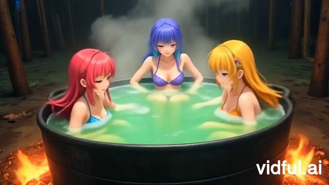 Три девчонки принимают ванну в подогреваемой огнем воде. Купание этих красавиц выглядит удивительным.