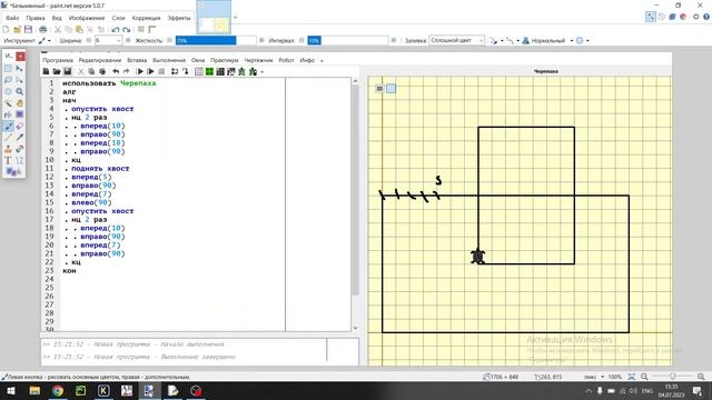 https://kompege.ru/variant?kim=25028275 Алгоритм для Черепахи использовать Черепаха алг нач опустить хвост нц 2 раз вперед(10) вправо(90) вперед(18) вправо(90) кц поднять хвост вперед(5) вправо(90) вперед(7) влево(90) опустить хвост нц 2 раз вперед(10) вправо(90) вперед(7) вправо(90) кц кон