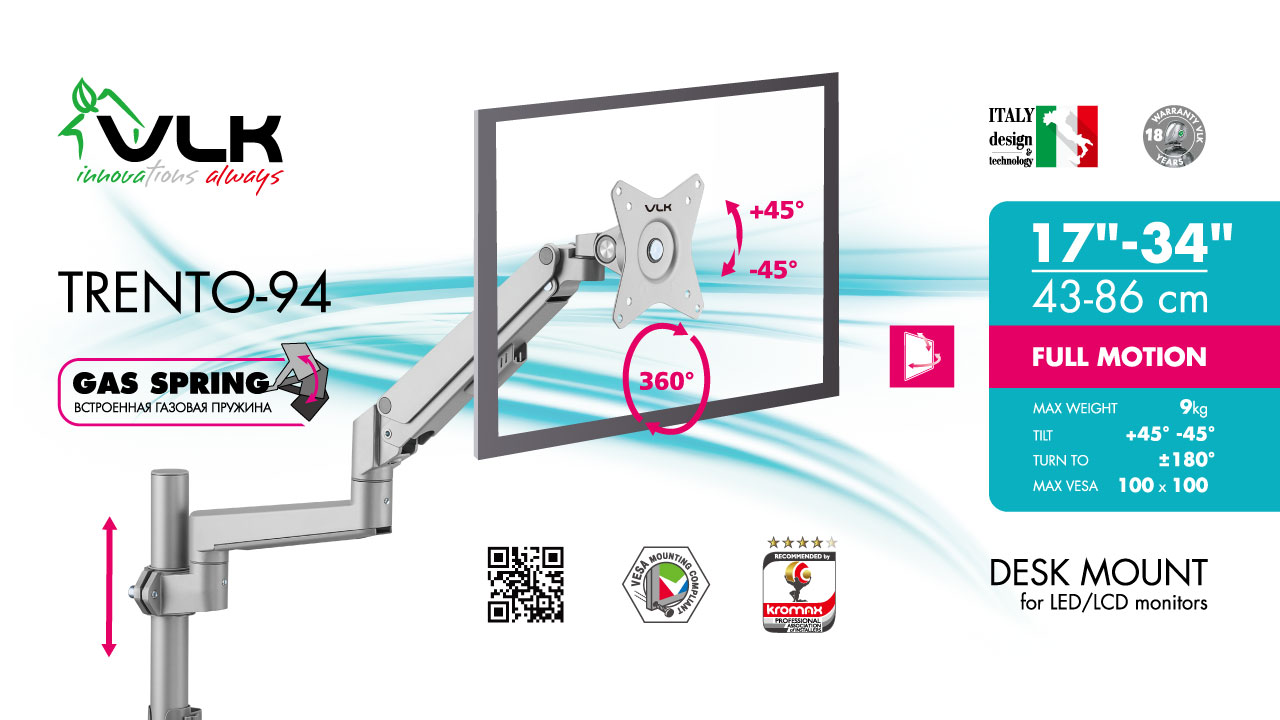 Настольный кронштейн для крепления телевизоров и мониторов VLK TRENTO-94 SILVER надёжно удержит экран размером 15"-34" дюйма и весом от 1 до 9 кг. Наклонно-поворотная регулировка позволит вращать экран на 360°, наклонять вверх и вниз на ±45°, и поворачивать влево и вправо на 360° – для оптимального угла зрения и удобной посадки. VLK TRENTO-94 SILVER имеет настольный тип установки с механизмом защиты от падения. Крепёжные отверстия настольного кронштейна VLK TRENTO-94 SILVER изготовлены по международному стандарту VESA. Кронштейн подходит для большинства мониторов популярных брендов, среди которых Samsung, LG, Sony, Panasonic, Sharp, Toshiba, Dell, ASUS, HP, Acer, BenQ, MSI, Philips, Lenovo, Sceptre, ViewSonic, Gigabyte, AOC, Viotek и других. В комплектацию VLK TRENTO-94 SILVER входят необходимые для монтажа материалы. Вся продукция обеспечивается гарантийными обязательствами. Подробнее: https://www.kromax.ru/produce/the_brackets_for_the_1st_monitor/12997/