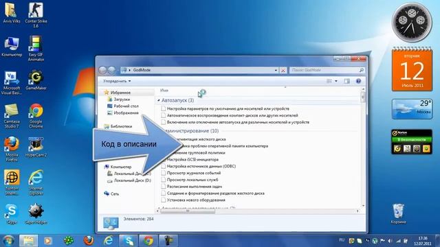 В этом видеоуроки я покажу режим бога в windows 7 как я сказал напишу код 1.Создаём папку 2.В название папки напишите. GodMode.{ED7BA470-8E54-465E-825C-99712043E01C} и всё!