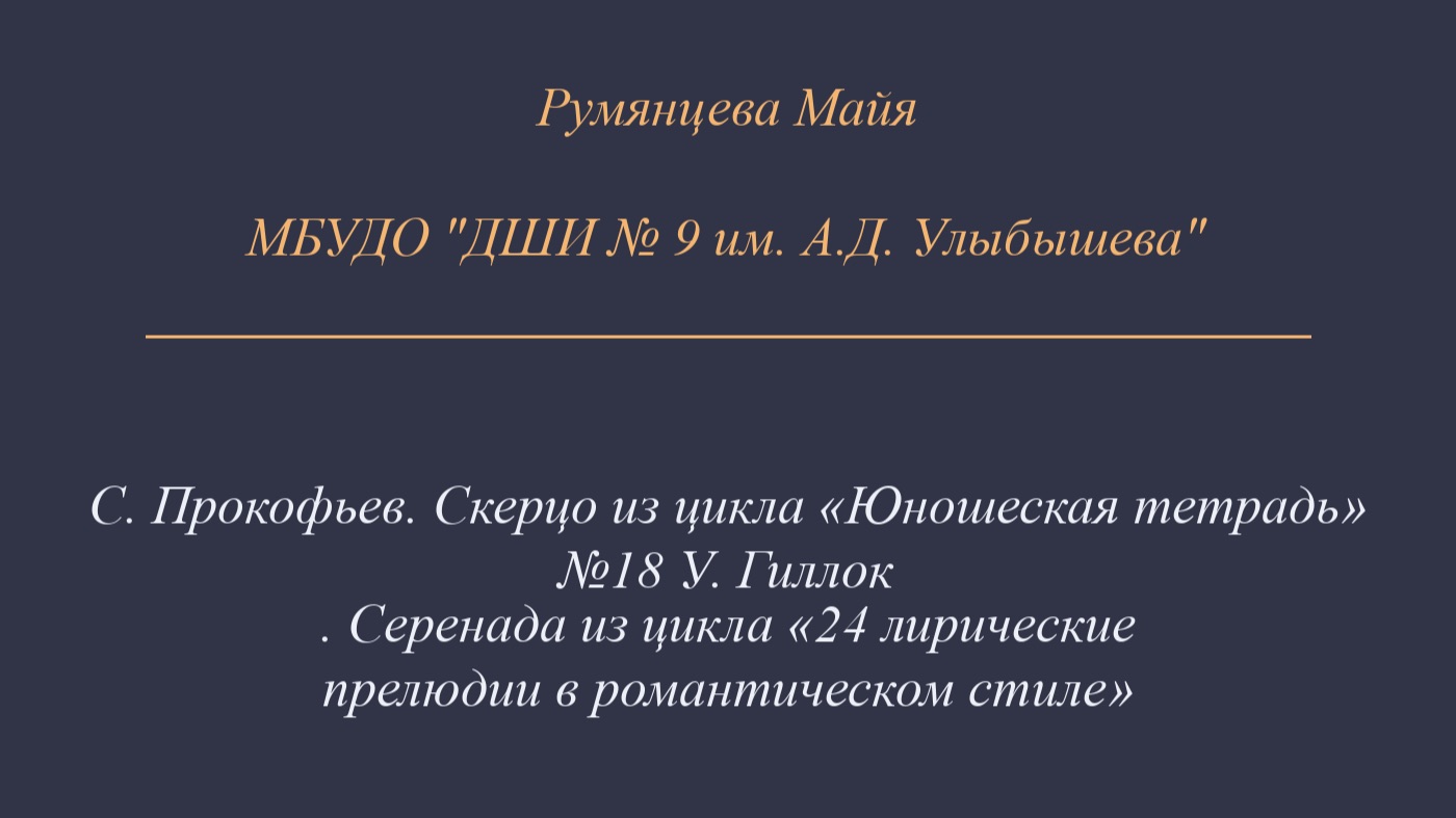 С. Прокофьев. Скерцо из цикла «Юношеская тетрадь» №18 У. Гиллок. Серенада из цикла «24 лирические прелюдии в романтическом стиле» Преподаватель Щикунова Татьяна Евгеньевна МБУ ДО "ДШИ № 9 им. А.Д. Улыбышева»