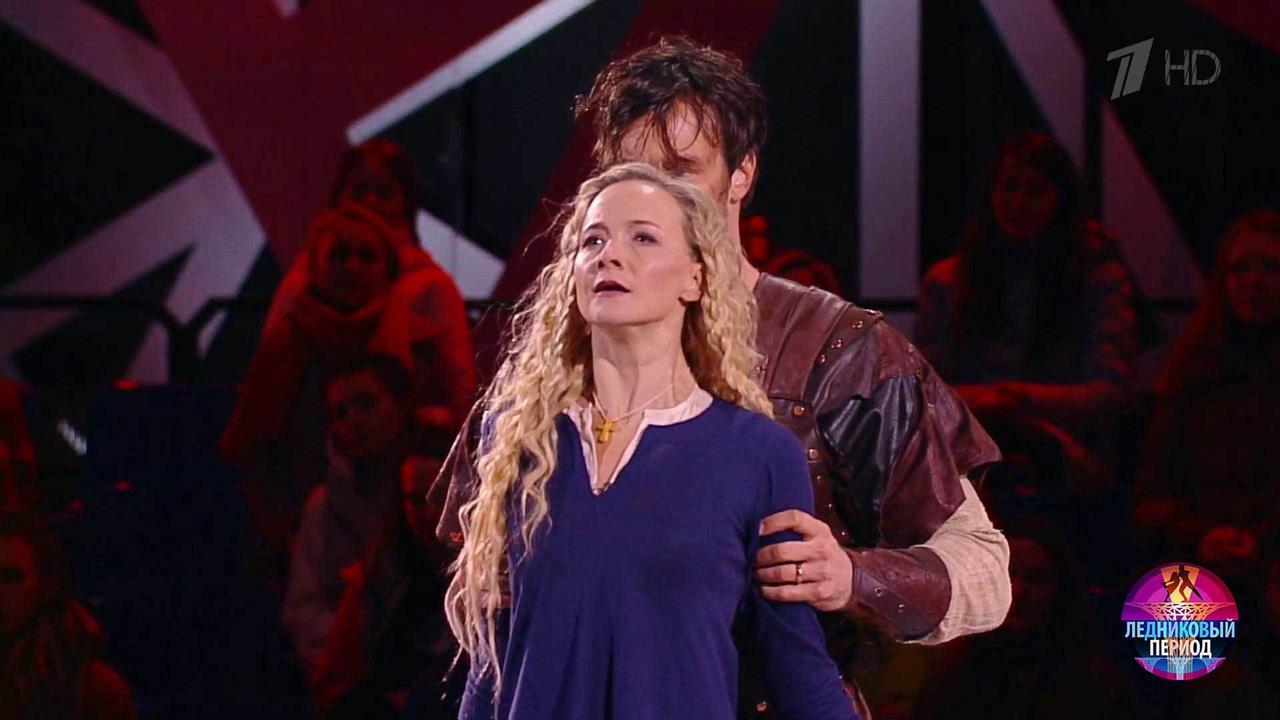 На льду – актер Вольфганг Черни и чемпионка мира Оксана Домнина. Они танцуют под музыку из кинофильма «Викинг».