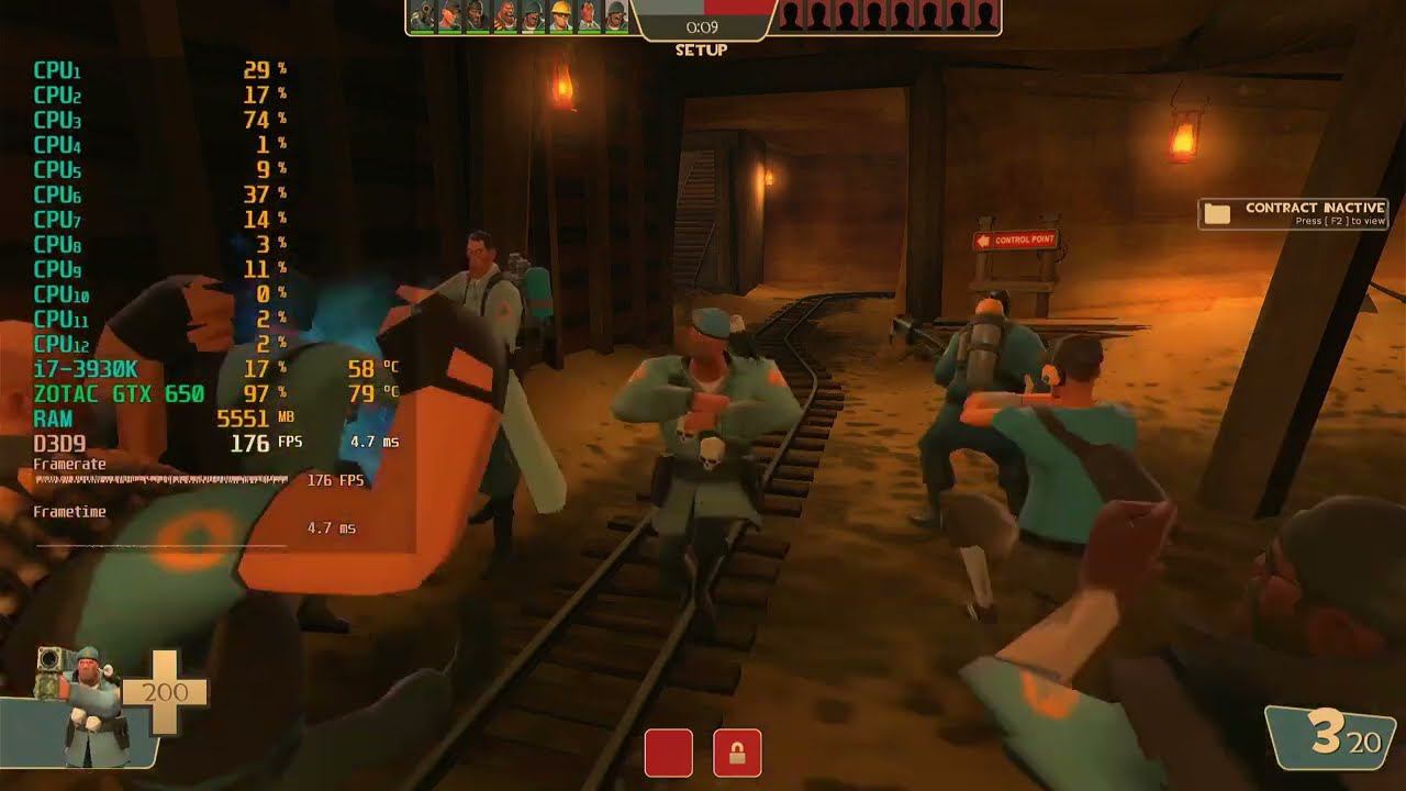 Game: Team Fortress 2 Сomputer characteristics: Socket: LGA 2011 Motherboard: Asus Sabertooth X79 Processor: i7 3930K 3.20GHZ RAM: HYPER X 16GB DDR3-DIMM 1600 GPU: ZOTAC GTX 650 GDDR5 2GB ROM: SSD 128GB+HDD 500GB Video in 1920x1080 resolution. Operating system: Windows 10 Pro