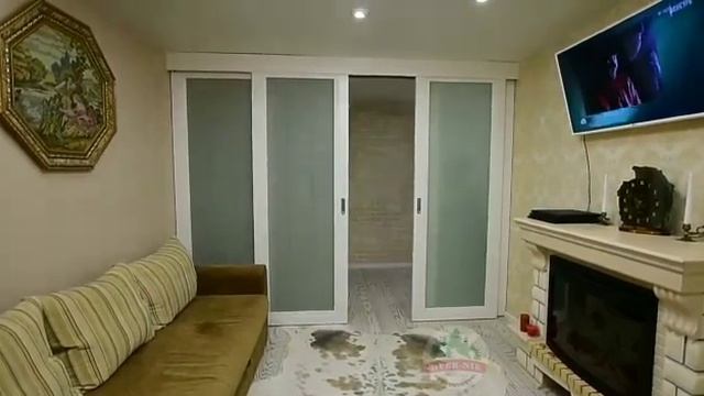 В этом видео показана установленная раздвижная перегородка из дерева. Открывание: внешние двери стационарные, а внутренние рабочие, с открыванием в разные стороны к стенам. Каркас дверей выполнен из массива дерева хвойных пород, с покрытием белая эмаль RAL 9010 (Pure White). Наполнение стекло белый триплекс 2+2=4 мм. с пескоструйным рисунком по эскизу. В видео представлено полное открывание и закрывание раздвижной перегородки.