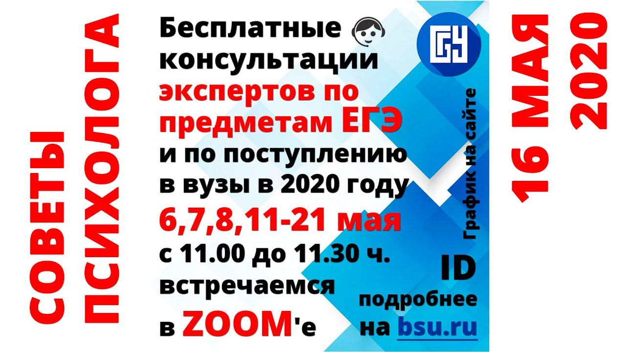 Уважаемые выпускники, их родители и классные руководители! С 6 по 21 мая пройдут бесплатные онлайн-консультации для учеников старших классов по всей России. 11 ведущих экспертов ЕГЭ проведут для вас консультации по всем общеобразовательным предметам, расскажут, как избежать ошибок и не потерять баллы. Ответственный секретарь Приемной комиссии БГУ даст подробную инструкцию, как будет проходить Приемная кампания-2020: что ждет абитуриентов, как в этом году подавать документы, какие существуют льготы, что такое конкурс, в какие даты будет проходить зачисление и многое другое. Консультации будут проходить на платформе ZOOM, присоединиться можно по ссылке https://us02web.zoom.us/j/9976663333 через ПК, планшет или телефон. Также будет вестись прямая трансляция с записью на канале "LifeBsu" в ютубе. Идентификатор конференции 997 666 3333 без пароля Начало консультаций в 11.00 согласно представленному графику. График онлайн-консультаций с экспертами по предметам ЕГЭ и по поступлению в вузы в 2020 году в новости по ссылке http://www.bsu.ru/news/22973/
