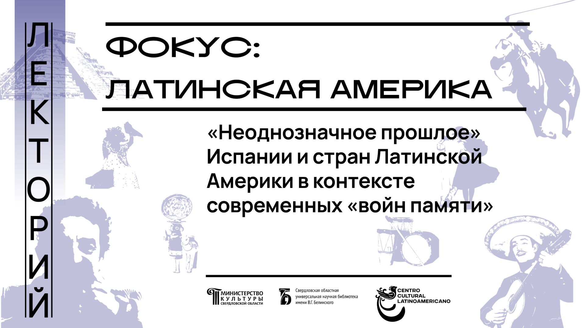 Лекторий «Фокус: Латинская Америка» приглашает читателей и гостей Белинки на новую лекцию, посвященную политике памяти в испаноязычных странах. Историк, доцент кафедры зарубежного регионоведения УрФУ Светлана Быкова расскажет о том, как важные, иногда трагические исторические периоды отражаются в памяти народов, и о том, кто и зачем может влиять на образы тех или иных событий в коллективной памяти. Свердловская областная универсальная научная библиотека им. Белинского http://book.uraic.ru/ сайт https://vk.com/club6745014 VK