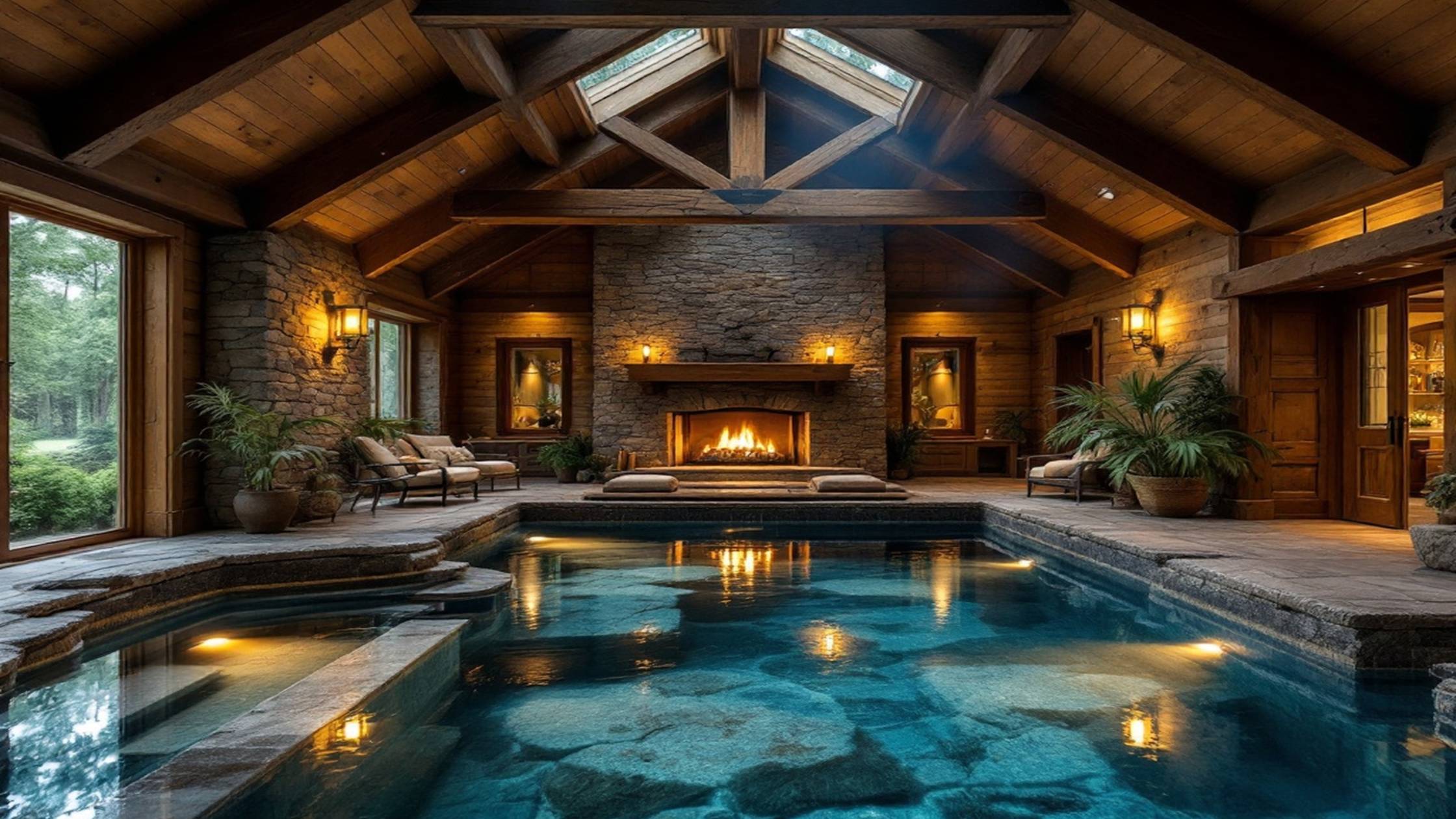 Уютная атмосфера: тёплый камин, дождик за окном и спокойный бассейн посреди комнаты. Отличный фон для учёбы, сна или просто отдыха. Наденьте наушники и наслаждайтесь покоем.