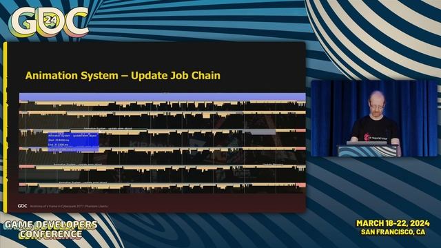 GDC 2024 Speaker: Charles Tremblay Company: CD Projekt RED Format: Programming Cyberpunk 2077 features an incredibly dense and action-packed world that places huge demands on CPU processingsomething that is pushed even further in the post-launch Episode Phantom Liberty. This talk dissects, in detail, a single CPU frame sampled from Phantom Liberty, in order to illustrate how the work for the various systems that drive the game are distributed across CPU cores in order to achieve 60 FPS gameplay in performance mode while updating one of the densest video game worlds to date. The process for how the team worked out their CPU budgets is described, as well as how they approached the challenge of balancing the desire to saturate CPU cores with useful work, and system update dependencies. Comparisons are made to CPU frames sampled in different gameplay situations to highlight the differences that can occur based on what is currently happening in the game.