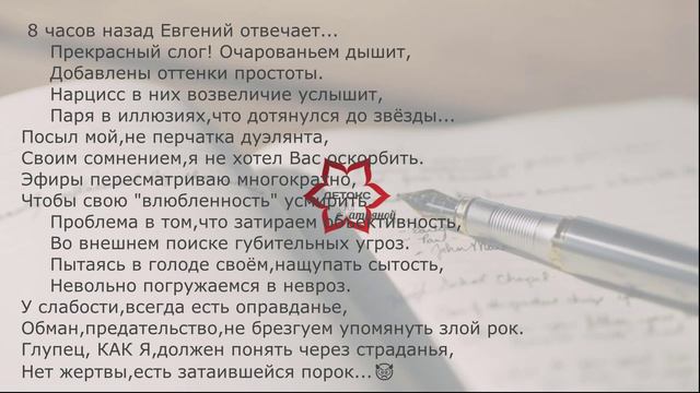 Благодарю за стихи и за интересный поэтический диалог... От автора: Отблагодарить меня Вы можете подпиской на канал. Интерес каждого из Вас к моему каналу Детокс очень важен для меня. Внимание подписчиков - огромная ценность для меня. Поддержать канал финансово или отправить донат на развитие канала можно по ссылке: https://donate.stream/donate_tarotanka00 Мои каналы на российских интернет-площадках: ТЕЛЕГРАММ Психология с Танкой https://t.me/+7NswX-2B31YzNmNi ЯНДЕКС ДЗЕН https://dzen.ru/id/62c4c1fa7286b12c3f8a9575?share_to=link RUTUBE https://rutube.ru/channel/27064920/ Инстаграм: @DetoksTanka На платформе YouTube: https://www.youtube.com/channel/UC-UhlGNYa8oFup62_meZd2g Личные консультации: detoksddt@yandex.ru По вопросам сотрудничества, организации выступлений, семинаров, партнерские мероприятия и проекты - пишите: detoksddt@yandex.ru Ваша Татьяна Детокс