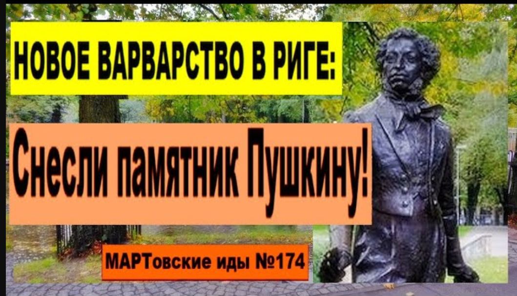 "НОВОЕ ВАРВАРСТВО В РИГЕ: Снесли памятник Пушкину!" Такова тема сегодняшнего выпуска новостей в рамках постоянной рубрики "МАРТовские иды №174". Рижское агентство памятников временно переместило скульптуру на склад. Дальнейшая судьба памятника Александру Сергеевичу Пушкину, установленного в латвийской столице ещё в 2009 году, до сих пор пока не ясна. Хотя, если рассуждать на трезвую голову, надо было сначала решить этот вопрос, а потом уже что-то перемещать.... См. видео!