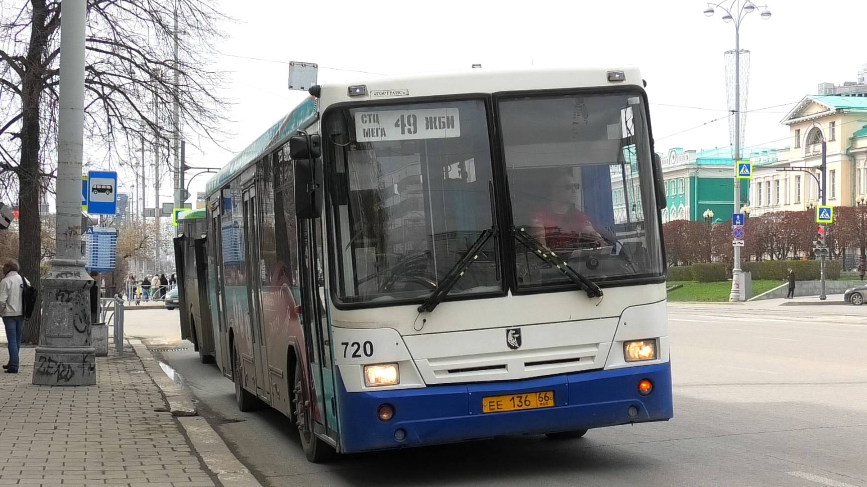 Автобус НефАЗ-5299-20-32 борт. №720 маршрут №49 "ТЦ "Мега - ЖБИ" следует через остановку "Площадь Труда". Город Екатеринбург, Россия. Приписка: Автобусное предприятие №2. 26.04.2024