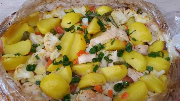 рецепт мясо индейки 300 г картофель 800 г цветная капуста 200 г фасоль 100 г помидор 1 шт. морковь 1 шт. лук репчатый 1 шт. соль, специи по вкусу растительное масло 4 ст.л. зеленый лук #вдуховке #рецептизиндейки #ужин #чтоприготовить #чтоприготовитьнаужин #обед #быстрыйрецепт #рецепты #индейкасовощами #кулинария #домашниерецепты #вкусноибыстро #ужинза30минут #вкусно #простойрецепт