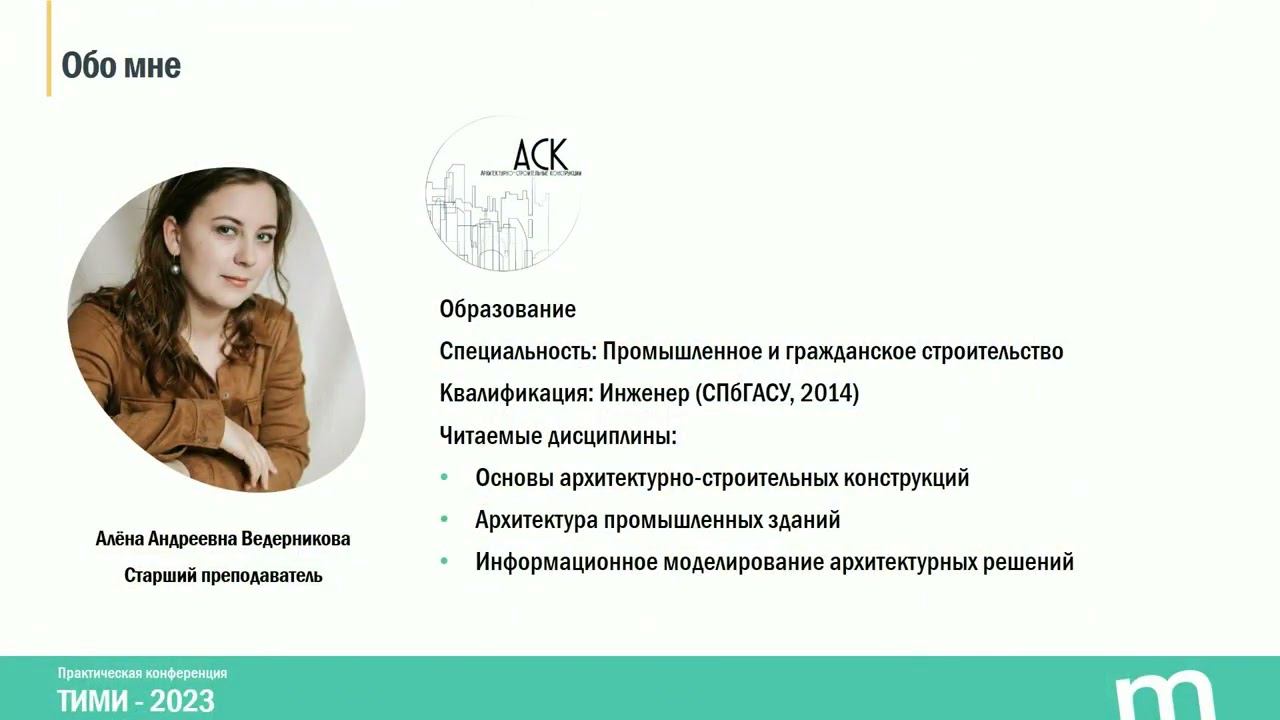 Ведерникова Алена Андреевна (СПбГАСУ), Нижегородцев Денис Валерьевич (СПбГАСУ). Тема доклада: "Инновационная методика формирования цифровых компетенций обучающихся с применением продуктов линейки Model Studio CS". 24 мая состоялась Практическая конференция «ТИМИ-2023. Технологии информационного моделирования и инжиниринга», организованная АО «СиСофт Девелопмент» совместно с генеральным партнером «Нанософт». *Формирование цифровых компетенций* Наш университет имеет большой опыт в формировании цифровых компетенций, связанных с технологиями информационного моделирования. Мы внедряем эти технологии уже более 6 лет как на этапе проектирования, так и на этапе строительства. В настоящее время у нас есть специальный отдел, который координирует использование технологий информационного моделирования на всех кафедрах и факультетах. *Разработка методологии и проекты* Model Studio CS – это наша инновационная образовательная методика для развития цифровых профессиональных компетенций. В 2022 году мы получили признание как федеральная инновационная платформа, где работаем над двумя проектами: один направлен на формирование цифровых профессиональных компетенций на основе нашего опыта, а другой – на распространение этой методологии в других университетах. *Важность биотехнологий и аксонометрические модели* Чтобы продемонстрировать свои знания в области биотехнологии, студенты создают подробные аксонометрические модели, которые точно отражают состав и требования проектов. Эти модели должны иметь уровень детализации не менее 250-300 единиц. *Подготовка к специализации «Информационные системы»* Специализация «Информационные системы» требует от студентов не только освоить моделирование, но и узнать об организации данных в этих системах. Программа фокусируется на практических навыках, таких как разработка плагинов с использованием API. *Повышение квалификации с помощью проектного обучения* Университет предлагает программы как для обычных студентов, так и для специалистов, стремящихся получить дополнительную квалификацию. Эти программы сочетают теоретические знания с практическим опытом, обучая людей работе с ПО независимо от дисциплин управления проектами. Официальный сайт Model Studio CS: https://www.modelstudiocs.ru/