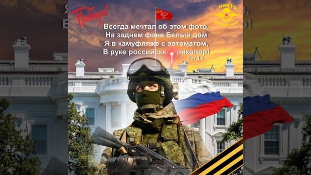 Мы входим в город Вашингтон! Вот скажи мне, американец, в чём сила! Разве в деньгах? Вот и брат говорит, что в деньгах. У тебя много денег, и чего? Я вот думаю, что сила в правде: у кого правда, тот и сильней! Вот ты обманул кого-то, денег нажил, и чего — ты сильней стал? Нет, не стал, потому что правды за тобой нету! А тот, кого обманул, за ним правда! Значит, он сильней! Сергей Бодров мл. Мы входим в город Вашингтон! Приказ! За спину автоматы! Достать из танка триколор! Ура... российскому солдату ! Мы входим в город Вашингтон! Вокруг десантники толпятся, Играет русская гармонь. Поют на русском и бранятся, Ура звучит со всех сторон. Стоят Арматы тихо в сквере, Капитолийский холм дымит. Левей майор на БТРе, О чем то важном говорит. Сидит у клумбы сонный Байден, Да трудный выдался денёк. И с идитским детским взглядом, Жуёт солдатский сухпапёк. С ним рядом Лиза, Шольц с Макроном, Жуют галеты натощак. Вокруг разбросаны патроны, И тлеет НАТОвский общак. Владимир тихо отвечает, На причитания Лизы Трасс. Войнушки мы не начинаем, А завершаем их у вас! Всегда мечтал об этом фото, На заднем фоне "Белый дом". Я в камуфляже с автоматом, В руке российский триколор! А я стою и наслаждаюсь, Крутя в руке своей айфон. И постепенно просыпаюсь, Какой же классный снился сон! P.S. Приказ! За спину автоматы! Достать из танка триколор! Ура... российскому солдату ! Мы входим в город Вашингтон! Лик Д.С.