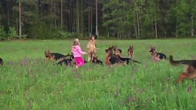 Маленькая девочка в огромной стае собак