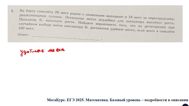 ЕГЭ. Математика. Базовый уровень. Задание 5. На борту самолёта 26 мест рядом с запасными выходами
